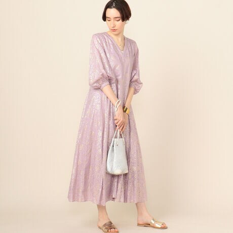ナチュラルな綿生地に、煌びやかなアラベスク模様の箔プリントを散りばめたVネックワンピース。ドラマティックなフレアシルエットやボリューム袖も印象的です。エスニック調でリラックス感がありながらも、1枚で華やかなコーディネートが完成。日常にもリゾートにも最適なアイテムです。