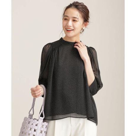 パワーショルダーのような立体的な袖がクラシカルな印象のブラウス。さらりとしたシフォンに細かなドットプリントをのせた生地が大人の女性らしく、ニュアンスのある装いに昇華。キレイめなパンツと合わせて通勤スタイルや、同素材のスカートとワンピース風の着こなしもおすすめです。