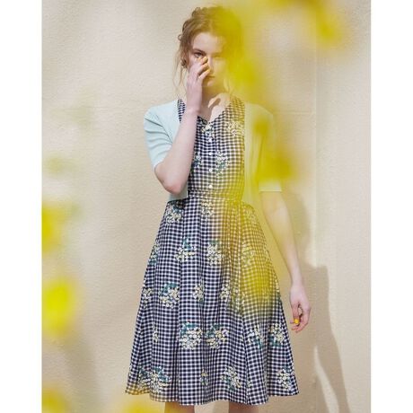 ギンガムチェックにスズランのお花を刺繍した、とても可憐なトレンドのシャツワンピース。スタッフにも大人気です。シワにもなりにくくデイリーに着こなしやすいドレスです。