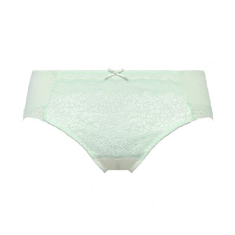 フロント上部に無地チュール、下部に花柄の編みレースを配したデザインです。センターにあしらった、リボンモチーフがポイント。