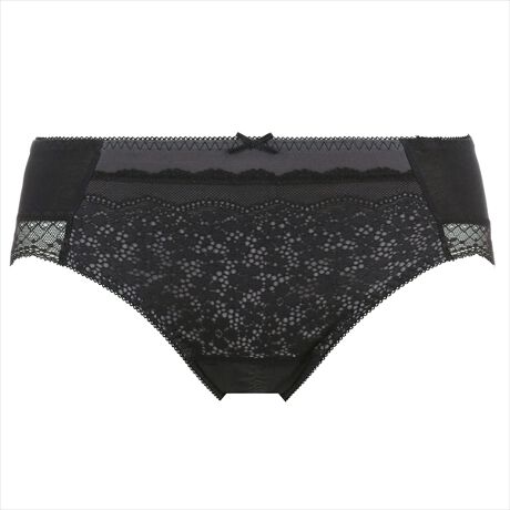 フロント上部に無地チュール、下部に花柄の編みレースを配したデザインです。センターにあしらった、リボンモチーフがポイント。