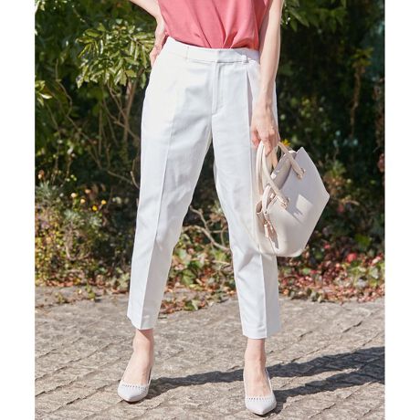 any SiS定番人気の美シルエットパンツ■デザインフロントワンタックでセンタープレスが入っており、きちんとした印象のシルエットになっています。後ろウエスト部分はゴム仕様で、股上を深めにしているので穿き心地も快適です。どんなスタイルにも合わせやすいany SiS定番のテーパードパンツです。■素材綿・ポリエステル・ポリウレタンの高密度タイプツイル素材を使用しています。オフホワイトは透けにくくするために他のカラーとは組織を変え、少し肉厚な素材にしています。ポイント1シルエットと穿き心地しっかりとした肉感なので綺麗なシルエットを表現できます。素材の仕上げに軽いエアタンブラー加工をしているので風合いが柔らかく、しなやかな穿き心地に。ポイント2UVケア高密度の織物であることでUVケアの機能も備わっており、紫外線の肌への透過率を下げる効果があります。ポイント3接触冷感紡績の段階で冷感剤を糸に練り込んでおり、着用の際に肌当たりがひんやりと感じられ夏の不快感を軽減してくれます。ポイント4撥水性生地表面に撥水剤による後加工を施しており、水に対する撥水性が付与されています。そのため水をはじきやすく、雨の日などの水染みを軽減してくれるのも嬉しいポイントです。■同素材アイテムこちらの商品は別カラーの展開もございます。詳しくは下記ページをご覧くださいクールタッチミラクルガード テーパード パンツ(PRWPNM0401)(ピンク・オフホワイト)※こちらのアイテムはカラーにより組成が異なります。※屋外での撮影画像は、光の加減で色味が違って見える場合がございます。商品の色味は、スタジオ撮影の画像をご参照ください。※商品画像はサンプルを使用しているため、色味やサイズ等の仕様に変更がある場合がございますので、予めご了承ください。