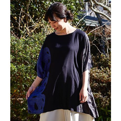 こちらのトップスは貫頭衣(かんとうい)をイメージしたデザイン。貫頭衣とは、布の中央に穴を開け、その穴に頭を通すタイプの衣服。弥生時代には一般的な衣服として着用されたといわれています。長い歴史を持つ貫頭衣に感化され、現代風にアレンジしたオリジナルデザイン。ゆったりとしたビッグシルエットとなめらかなレーヨン素材で、リラックス感のある着心地です。