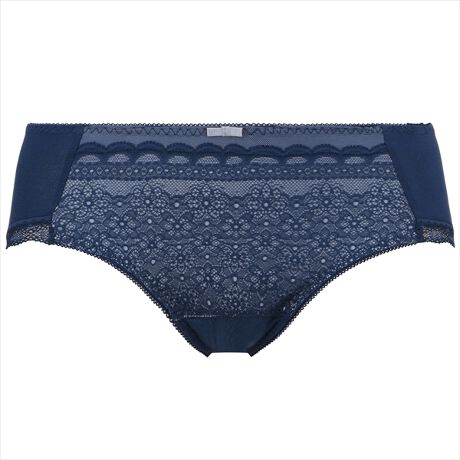 夜用ロングタイプナプキンに対応できる、サニタリーショーツ。フロント上部に無地チュール、下部に花柄の編みレースを配したデザイン。