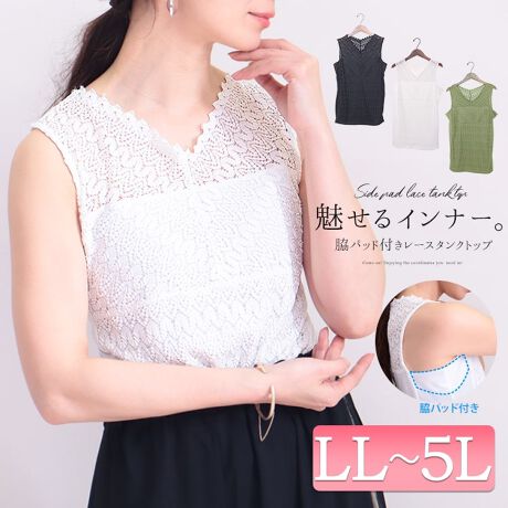 【LL-5L】魅せるインナー脇パッド付レースタンクトップ 大きいサイズ レディース トップス タンク
