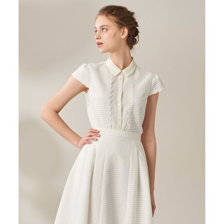 スポーティなメッシュ素材をベースに、レースとドットファブリックを組み合わせたブラウスです。1枚で着映えするトレンド感がありながらも可憐でクラシカルな雰囲気はTOCCAならでは。カーディガンも羽織りやすいサイズ感となっております。