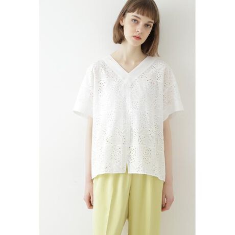 綿のローン素材に、幾何モチーフと花柄モチーフを組み合わせたアイレット刺□を施した涼し気な素材を使用。細かいアイレット(穴)が前面に刺□されているので、真夏に向けても長く着用出来る素材感が特徴です。形はややゆったりとしたサイズ感で、すこし抜け襟気味で着用していただくとこなれたラフさが出るトップスです。スカートに合わせる際は、フロント部分の裾を少しインしていただくとバランスよい着こなしになります。※トップスはオフ、ブラック展開です。