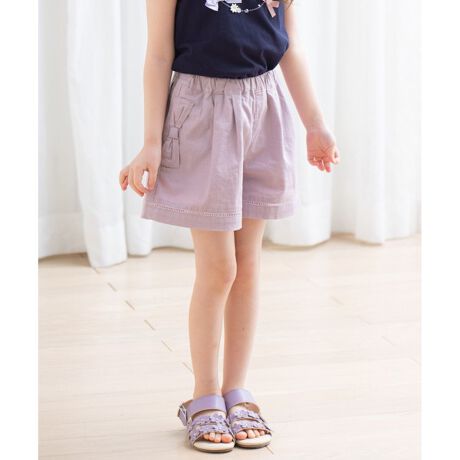 裾の梯子レースがポイントのシンプルなショートパンツ。 ポケット口がリボンモチーフのデザインになっており、キュートな印象がプラス! くすみカラーでコーディネートを大人顔に。暑い夏でも涼しく快適なショート丈パンツは1枚は持っておきたいアイテム。ウエストはゴム仕様となっており、お子様お一人での着脱もしやすいデザインです。ポケットが付いているので、通園通学にもぴったり♪ ◇any FAM KIDS X サスティナブル ◇
