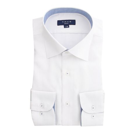 清潔感のある白無地の長袖ドレスシャツです。衿型は衿開きが大きくネクタイとのバランスが取りやすい、タイドアップで主流のワイドカラーを採用しています。結び方は横に広がった逆三角形で、ボリュームのある結び目が綺麗なウィンザーノットがおすすめです。