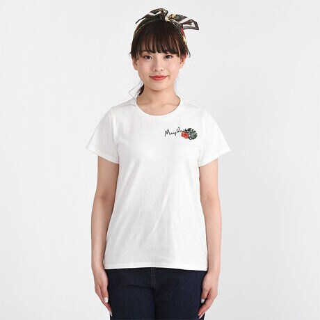 ワンポイントが上品な印象の半袖Tシャツ。サインロゴはスパンコール、ハイビスカスは刺繍で表現した、こだわりの一枚です。左脇のピスネームもポイント。レッド系の刺繍が映えるホワイトと、イエロー系の刺繍がなじむベージュとの2色展開で、キレイめスタイルにもおすすめです。