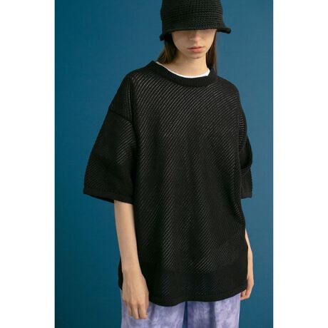 バイアス状に編んだメッシュニットTシャツ。