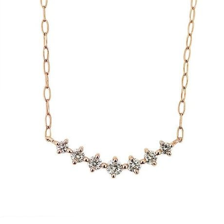 緩やかな曲線のカーブが美しいネックレス。ダイヤモンドの輝きが、胸元を繊細に見せてくれます。7石のダイヤモンドは、センターから向かって大きさがグラデーションになっています。とても優しい品のある印象をあたえてくれるアイテムです。また、地金に使用している18金ピンクゴールドは、日本人の肌に馴染みが良いといわれます。ダイヤモンドが良く映えるピンクゴールドは、世代を問わず人気の高い素材です。シンプルで華奢なネックレスだから、普段使いとしても重宝します。