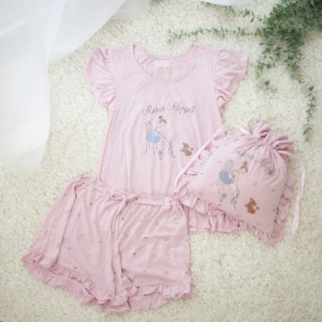 Risa Magliのロゴと、バレリーナ×トイプードルがプリントされたルームウェアシリーズ。