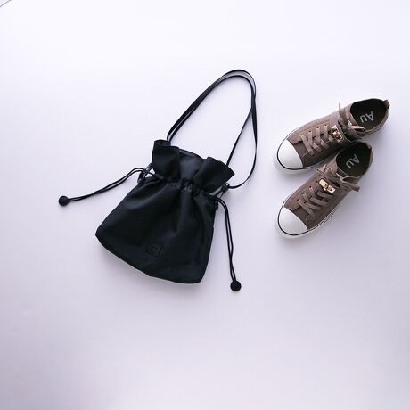 よくあるサコッシュではなく、巾着型で出し入れも簡単、背胴のファスナーポケットにも長財布等も入るサイズ感。