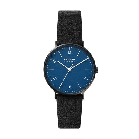 再生紙100%のブルーダイヤルを配したリサイクルステンレススチール製ケースに、ブラックのマルベリービーガンレザーストラップを組み合わせました。