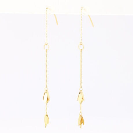 小さなオーキッドのレイをイメージして、オリジナルで作成したミニリーフ型のパーツをお花のように束ねた、地金パーツの組み方がポイントのピアス。小ぶりながらも耳元で揺れると目を引く存在感を実現します。シャープなカットの喜平チェーンを組み合わせたのも新鮮。ピアスチャームとしても使用出来るお得な2way仕様です。