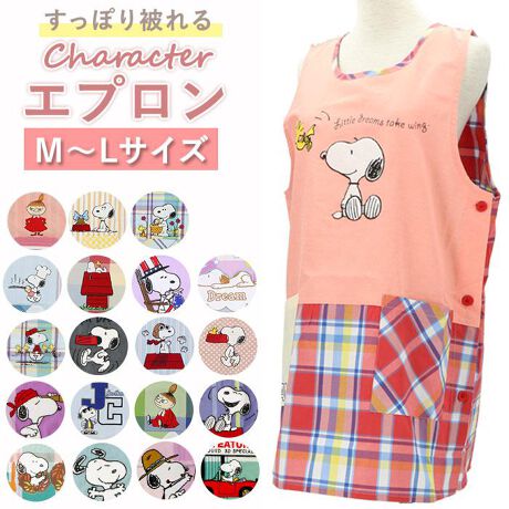 キャラクタープリントが可愛い♪チュニックのように着こなせる、すっぽり被れるエプロン。脇にあるサイドボタンを開けて、頭から被るタイプ。肩ひもがずれ落ちる心配もなくアクティヴに動ける♪体を覆う面積が広いので、お洋服を汚れからしっかりガード。左右には使い勝手のよい大きめポケット付き。ハンカチなどを入れるのに便利。お料理のときだけでなく、庭仕事や地域のイベントなどでも大活躍。カラーにより布地の組み合わせやデザインのバリエーションも豊富!お気に入りを見つけて♪
