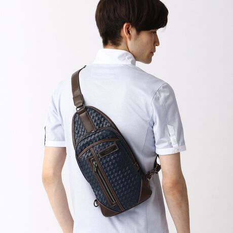 メッシュの編み込みが目を惹くボディバッグを展開。型押しではなく、フェイクレザーを編み上げているため高級感が出ます。正面と内部ポケットも豊富で収納もしっかり入ります。背中に当たる部分はクッション性の高いメッシュ素材を採用。通年でご使用しやすいボディバッグに仕上げました。