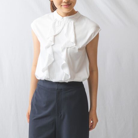 前身頃中心とフリルは光沢があり、落ち感のあるポリエステルのテレコを使い素材のコントラストを楽しんだデザインです。前身頃を中心にデザインを入れているので、ジャケットインにしても胸元華やかに。オフィスで、またリモートワークにも最適なカットソーBLです。\n\n・ストレッチあり\n・透け感なし\n・カラー展開はホワイト、ブラック\n・サイズ展開は1(M)9号・2(L)11号・3(2L)13号