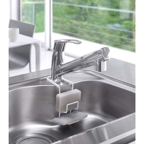 蛇口を挟み込むだけの簡単取り付け。スチールの取り付け部がしっかりホールドするので、ずれ落ちることなく快適に使用できるスポンジホルダーです。シリコンカバーが付いているので、蛇口やシンクを傷つけることがありません。
