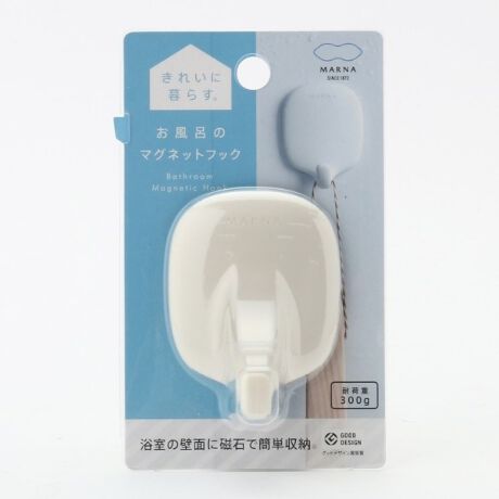 耐荷重:約300g。お風呂の壁に付けられるマグネットフック。マグネットだから簡単に付けはずしができて、長めのフックで色々なものがかけられます。さびないラバーマグネットを使用。