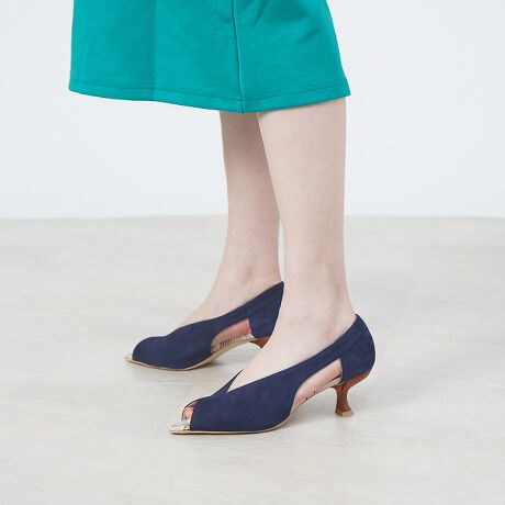 オープン・トゥよりもつま先の開きが小さくよりエレガントな印象のピープトゥ、スマートに見えるようにトゥを少し長くしてアクセントカラーをのせました。