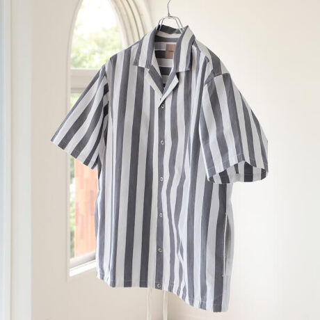 極太ピッチのブロードストライプ生地を使ったブルゾンテイストの半袖シャツ。裾のストリングスでフォルムの調整が可能。ハリのある生地感とたっぷり目のシルエットで、ユニークな着こなしが可能です。
