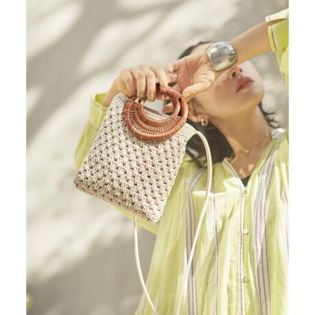 ライフスタイルプランナー長屋なぎさ氏とのスペシャルコラボ第5弾。天然素材のハンドルを使用した、ナチュラルな雰囲気を放つ編みショルダーバッグ。お出掛けに必要な最小限の物が入る小ぶりなサイズ感が使い勝手良く、身軽に持てるのが嬉しい◎。夏らしい編み柄がコーディネートのポイントになるアイテムです。