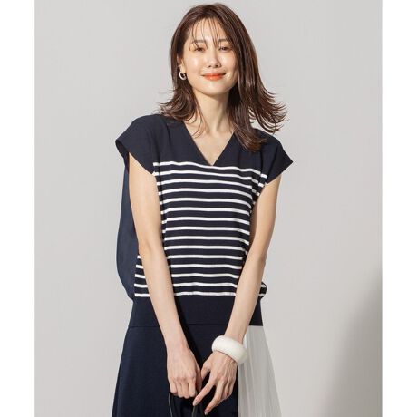 ニット素材×バックはふんわりギャザー素材の異素材コンビのボーダーVネックニット■デザイン抜け感のある生地素材をドッキングしたニットプルオーバー。後ろ身頃はギャザーでふんわりボリューム感を持たせ、裾はリブ編みですっきりとさせたメリハリのあるシルエットに仕上げました。腕の一番気になる部分をさりげなくカバー出来る袖感も嬉しいこだわりポイント。同素材のスカートとのスタイリングは勿論、デニムパンツ合わせでマリンな印象にするのもおすすめです。肌当たりもさらっとして肌離れが良いので、夏へ向けてもストレスフリーに着て頂けます。 ■素材 ポリエステル混のさらりとして清涼感のある素材が、春〜夏に最適な素材です。 落ち感が少なく、肌離れが良いので、軽快に着て頂けます。 ご家庭での手洗いでのお洗濯も可能です。 ▼セットアップ対応