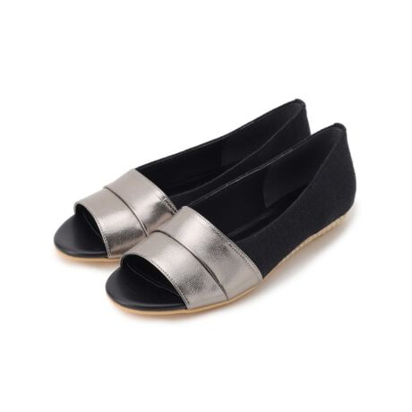ジュート風のソールやナチュラルな風合いのファブリック使いが、足元を涼し気に演出するフラットシューズ。