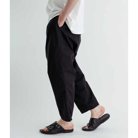 シルエットは2タックで後ろウエストがゴム仕様になっており、ヒップからワタリに掛けて たっぷりとボリュームがあるので、リラックスした雰囲気で着用していただけます。また、裾に向かってテーパードを効かせているのとアンクル丈にしているので、足元が重く見えずにワイドパンツが初めての方でも、簡単にこなれた印象に。