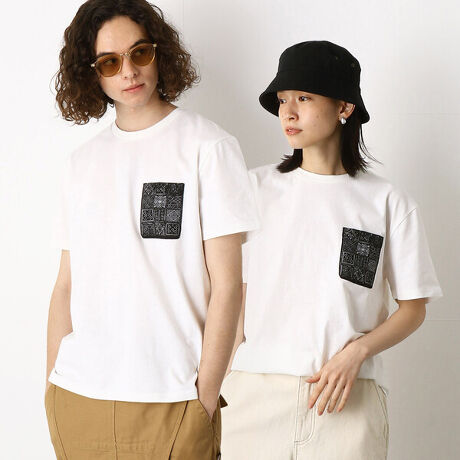 パープル&イエローの胸ポケット付 半袖Tシャツ。