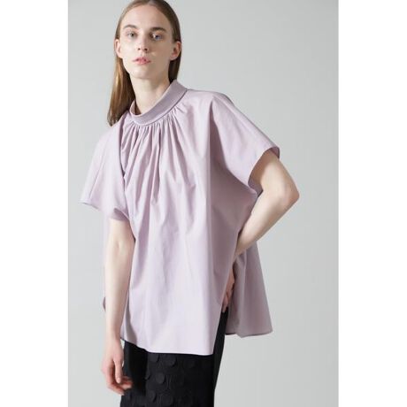 肌馴染みがよいコットン素材です。シワになりにくく、反発感と清涼感が特徴です。適度なハリコシと抜け感を演出します。ギャザーのデザインがフェミニンなブラウスでトレンドカラーのピンクがお勧め。