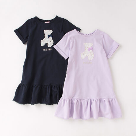 レースを使った上品なクマ刺しゅうをほどこしたワンピースです。甘いディテールに清涼感のあるカノコ素材が合わさった、アンバランスさがおしゃれポイント♪ 裾にはフレアに仕上げて、動いたときの可愛さにもフォーカス。両側にポケットつきです。