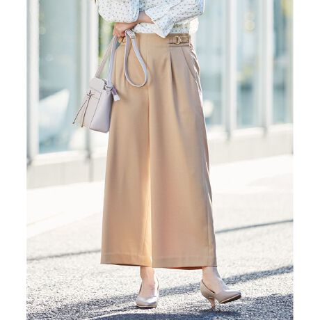 きれいなワイドシルエットでオフィスからカジュアルまでしっかりカバー!着回し力抜群のきれいめボトムス。■デザイン両脇のDカンディテールがポイントのワイドパンツです。フロント部分にベルト切り替えがないデザインなのでかっちりとし過ぎず、すっきりとしたウエスト周りになっています。後ろ部分にはゴムが入っているので、楽な穿き心地です。裾も広がりすぎないワイドシルエットで、小柄な方でも着こなしやすい丈感に仕上げました。■素材タテ・ヨコ両方にポリウレタンをいれることで、2WAYストレッチの機能を持たせた穿き心地の良いツイル素材を使用しています。ポリエステル主体で安心感のある厚みなので取り扱いもしやすく、しわになりにくいさらっとした風合いも特徴です。様々な太さの糸を使用することで、天然素材のような見え方や表情に奥行き感を持たせており、綺麗めながらナチュラルな印象も併せ持っています。※洗濯機で洗えます。※商品画像はサンプルを使用しているため、色味やサイズ等の仕様に変更がある場合がございますので、予めご了承ください。※屋外での撮影画像は、光の加減で色味が違って見える場合がございます。商品の色味はスタジオ撮影の画像をご参照ください。