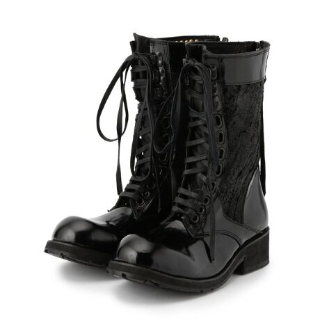 パテントレザーを使用した編み上げブーツ。折り返し部分にスタッズを付け、KMRiiらしいブーツ仕上げています。ブーツインはもちろん、クロップドパンツに合わせても良いアイテムになります。KMRii[ケムリ] 2000年にLui Onozaki氏によりブランド設立。 世界中を旅しアンティークや民族美術などにインスパイアされたデザイナーLui氏が厳選された素材を用いてフルハンドメイドで製作するブランド。 インダストリアル(工業的)な雰囲気をレザーへ落とし込む手法を用い世界中を旅して得たインスピレーションを表現している。