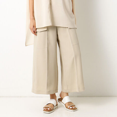 《デザイン》ミリタリーなテイストのポケットが特徴のワイドパンツです。あえてきれいめな素材でつくることで カジュアルになりすぎないデザインにしています。前側の膝上のフラップポケットと後ろのポケットは飾りです。ポケットに沿ったステッチもデザインのアクセントとなり、コーディネートに取りいれるだけでこなれた雰囲気に仕上がります。太めなデザインながらも広がりすぎないすっきりとしたシルエットです。センターの接ぎ線が縦のラインを強調して、よりすっきりとみせます。《素材》マットでドライタッチな質感の生地です。ポリエステル糸とレーヨン糸を合わせて撚った特殊な糸を使用したことで、程良い肉感とふくらみがありながら、柔らかく落ち感のある素材に仕上げています。パンツには欠かせないストレッチ性も備わっているため、穿き心地も抜群です。