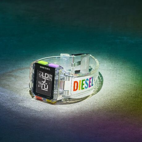 デジタルディスプレイダイヤルにユニセックスデザインをMIXさせてリブートした”CHOPPED”コレクション。マルチカラーのロゴが入ったシースルーのPUストラップが特徴的なDIESELの限定モデルです。