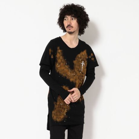 コットンとレーヨンの柔らかい素材を使用した、着丈が長めのレイヤード仕様が特徴的なデザインです。身頃はムラ染をイメージし左胸にはブランドロゴのアーチプリントが施されています。SWITCHBLADE/スイッチブレード Hiromu Takahara(元Roenデザイナーで現在BLACK HONEY CHILI COOKIEデザイナー)とHYDEによる新ブランドです。 時代の変化の中 不良でいる良さを失くしたくない 内に秘めたナイフのように自分なりのナイフを出せる人達に向けたブランドです。