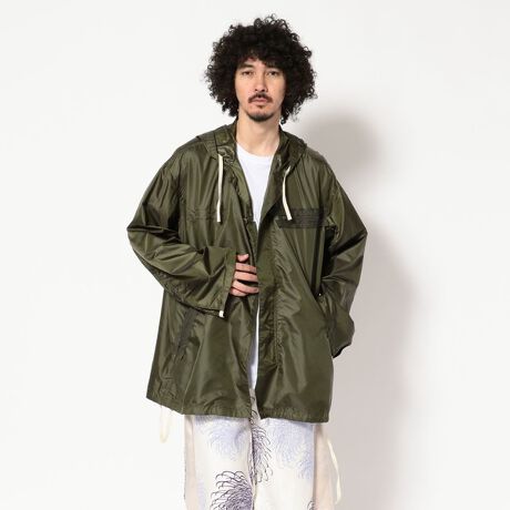 薄手のリップストップナイロン素材を使用したレインパーカー。裾、袖には紐を入れることでシルエットに変化がつけられる仕様。ポケッタブルなので小さく収納も可能。梅雨時期の軽い羽織として重宝する一着です。【CLAMP/クランプ】2015年FWに立ち上がった男女ユニットのデザインチームブランド伝統あるカルチャー、ミリタリー、ワークのデザインソースと現代のマテリアル、パターンメイキングで新旧の融合を図るプロダクトブランド。古くから伝わる実用着を現代的にモディファイされたデザインは後世に残るヴィンテージになっていくはずです。都内では「吾亦紅」のみでのお取り扱い。