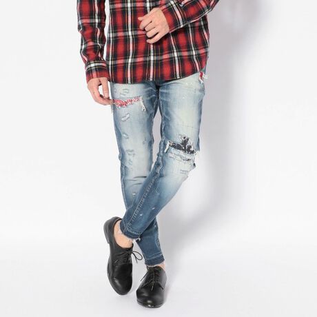 SURT待望の新作入荷!程よいダメージ加工と、更にダメージの裏側にバンダナを施した新作です。穿き心地はもちろん、カジュアルなスタイリングにピッタリな仕上がりになっています。今まででは考えられなかった超次世代型ハイパワーストレッチデニムを使用しSURTが持っている「ART、SURF、SKATE」のライフスタイルカルチャーと融合して、あらゆるモーションに対応したアスレジャージーンズを日本で最初にジーンズを製作したBIGJOHNと共に開発しました。 日常生活から、車、飛行機や新幹線などの長時間移動など様々なシチュエーションでストレスフリーです。簡単に言うと、ほぼ二倍伸びて元通りに戻る素材で出来たジーンズです。トルコの素材メーカーISKOの特許技術で実現した驚愕の伸縮性を持った生地になります。他社の素材との最大の違いは戻る(キックバックする)力です。一般的に伸びるだけの素材なら他にもあるのですが、ここまで元通りに戻る力を持ったデニムはISKOの特許でしか実現出来ません。この素材をBIGJOHNが特注してリアルユーズドが表現できる素材として別注しています。