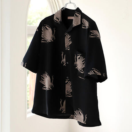 オリジナルフラワープリントシリーズ「バンクシア」のオープンカラーシャツを、サイズバランスをより現代的にアップデート。程よい余裕を持ったシルエットや広くとったバックヨークにリングドットを採用しシャープな印象のフロントボタンがポイント。落ち感のあるオリジナルプリント生地は、鈍い光沢が特徴です。