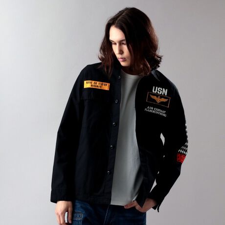 中肉で適度にストレッチの利いたコットンバックサテン生地を採用。裾に玉縁ポケットを配することで、ジャケット感覚で羽織れるスタイルにしています。グラフィックは「TOP GUN/トップガン」をモチーフに、パッチやプリント、生地パッチなど様々な手法を組み合わせ立体感のある見え方になっています。大きな胸のポケットや大きなフリントの釦でミリタリー感を表現しています。※画像の商品はサンプルです。実際の商品では、仕様・加工等若干異なる場合がございます。【AVIREX/アヴィレックス】いくつものフライトジャケットをコントラクターとして納入してきた、AVIREXは高い機能性を持つフライトジャケットの魅力を一般市場にも広めるため、その要素を随所に取り入れたサープラスウェアも創り出している。その無駄の無いデザイン、ノスタルジックな味わいは世界中の多くの人々から支持され続けている。大空に思いをはせた飛行家(アヴィエーター)を称えるAVIREX(空の王様)から生まれた名である。■お使いのパソコンのモニターによって、実物商品とカラーが異なって見える場合があります。誠に申し訳ございませんが、ご理解下さいます様お願いいたします。■当ショップの在庫数は 直営店舗の商品も含まれています。在庫数が日々変動する為、ご注文頂いた時点で在庫が完売になっている場合がございます。■サイズ表は、製品の生地や織りなどの特性により、多少の誤差はございます。予めご了承ください。
