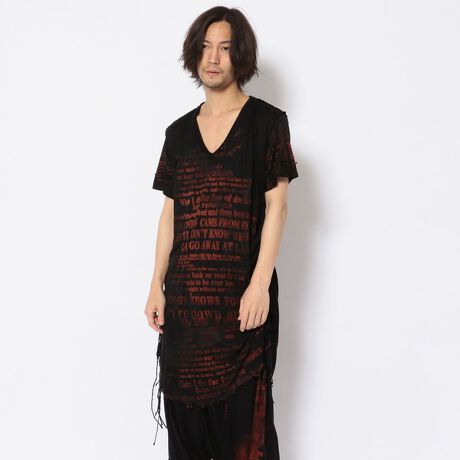 全体に入った英字プリントが特徴的なカットソー。プリントの上から顔料を吹き付け、陰影感を出しています。裾のアシンメトリーデザインや、サイドのレザー編み上げが『TT』らしい仕上がり。ベストやカーディガンと合わせて欲しいアイテムになります。※ハンドメイドの為、1点物になりますTT/ティーティーデザイナー: Takamiya Shohei作家時代を経て、2016年に正式にブランドをスタートさせる。素材の仕入れ、加工、縫製に至るまで全ての工程をデザイナーが行う。それ故に全作品がハンドメイドであり、1点物という製作形態を貫く。『TT』はROYAL FLASHのみの展開になります。