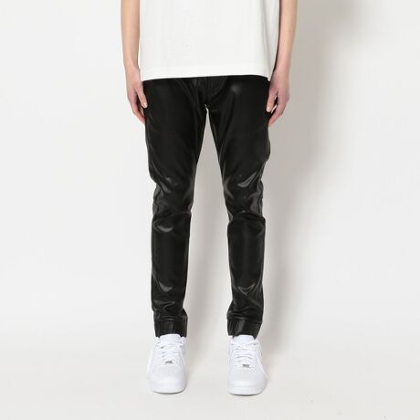 DankeSchonボディーにコーティングを施す事でレザーパンツのような表情に仕上げられたジョガーパンツ。スリムシルエットのジョガーパンツにコーティングすることでラフな印象を払しょくしモード感漂うデザインに作り上げられています。ウェストのコードにもダストカラーのこだわりを持たせているのでスタイリングのアクセントとしても見せてお使いいただけます。収縮性の強い素材を使用しているので体へフィットするスリムシルエットながらもストレスフリーな履き心地。全体はミニマルなデザインに仕上げているのでスタイルに固まらずカジュアルからモード、ストリート、トラッドと幅広いスタイリングに取り入れて頂けます。PUならではの光沢感でシャツやジャケットと合わせたスタイリングもお勧めです。Model1:184cm 着用サイズ:XLModel2:178cm 着用サイズ:LDankeSchon・・・DankeSchonとは、このブランドの核となるキーワードD digitaliyデジタル式A Architect創造者N neologism新表現K kittenish悪ふざけE engrossing心を奪うの頭文字を組み合わせたものにドイツ語のSchonを付け、ブランドの意図に賛同してくれる人達に感謝の意味を込め、「DankeSchon(ありがとうの意味)」としている。ファッションのテーマは「ニュースタンダード」。 時代に抗うのではなく、すり抜け受け流すことでブランドに見合う要素を抽出し、高品質な素材と、デジタライズなグラフィックを掛け合わせコレクションに落としていく。純粋なシルエット、ディテールへの徹底したこだわりと同時に、ユニークで新しい見解も積極的に取り入れる。そこから生み出された製品は、実用的でごく自然に日常に馴染むもの。メモ