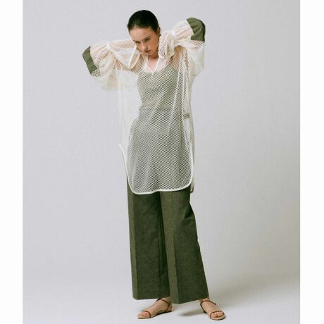 RUMBLE RED(ランブルレッド) Commando Mesh BlouseRUMBLE REDのフォーストシーズンから続くコマンドセーター(イギリス軍が開発した1940年代から続くミリタリーセーター)のディテールを取り入れ、女性らしいデザインに昇華させたアイテム。適度に光沢のある質感のあるメッシュ地を使用し、袖をバルーンスリーブにし、袖口のフリルがポイント。長めの丈感でフェミニンな雰囲気になっています。コマンドセーターのディテールである型と肘のパッチがアクセントになり、RUMBLE RED得意の女性らしくもミリタリー感のあるアイテムに仕上がっています。【RUMBLE RED/ランブルレッド】WORK 、MILITARY 、 SPORT 、 MOTORCYCLE 、 VINTAGE…これらは男たちがつくった格好よくて逞しい刺激的な世界。RUMBLE REDには、「共鳴する心」という意味を込めました。それは、異なるモノでも重なる部分は必ず存在することを示唆します。すなわち、わたしたち、女性も格好よくて逞しい。あの楽園をこの手に。わがままなわたしたちは、あの楽園をも手にし、格好よく逞しく、そして、美しく創造します。