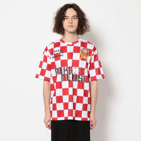 Liberal Youth Ministryユニフォームをオマージュしたユニークなトングスリーブ。目を惹くカラーリングに「FAKE NEWS」のロゴがアクセントになっています。柄に溶け込むようなキャラクターがワンポイントです。方の落ちるドロップショルダーに身幅もゆとりを持たせたリラックスフィット。ナイロン素材のショートパンツやトラックパンツなどスポーツMIXスタイルがお勧めです。サポーターを思わせるデニムやチノパンなどとも相性抜群ですのでコーディネートの幅が広がる一枚です。“COMME des GARCONS”の創立者 川久保玲も認めた注目のブランドがついに20FWより取扱スタート。LYM”はメキシコ発レーベル”Weimar Youths”を手掛けるAntonio Zaragoza(アントニオサラゴサ)による創造的なブランド。”メキシコ”という国へのこだわりが強く、メキシコ国内若年層の社会問題・抗争やドラッグ、サブカルチャー、教育、腐敗した政府など、未来が失われていくメキシコ社会を表現しています。”