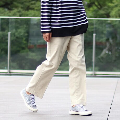 表情のある織地を使ったクラシックスタイルのワークトラウザー。ポリウレタン混紡のやや伸び感のある生地を使ったベーシックなストレートシルエットで、どんなアイテムともコーディネートできる便利なアイテムです。
