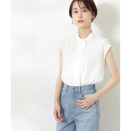 N.で人気のボウタイ風ブラウスのノースリーブが登場。詰まった首元に甘すぎないボウタイ風デザインがポイントです。結び直しが必要ないので着やすさも抜群です。柔らかい素材で心地よく、背中にタックをあしらい動きやすさを高めています。デニムカジュアルから、リモートやオフィスのきれい目スタイルにも着まわしできます。