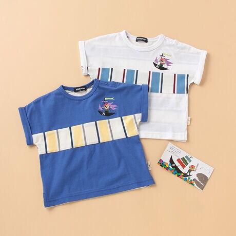 ボーダーと無地を巧みに切り替えたおしゃれセンスただようTシャツです。元気にアピールする海賊のトニー刺しゅうがデザインのポイント! シンプルボトムスと合わせてもっとアイテムを主張するのがオススメです。この商品1点につきポリオワクチン1人分がJCVに寄付されます。ミニ絵本つき。※80、90サイズのみ肩開き